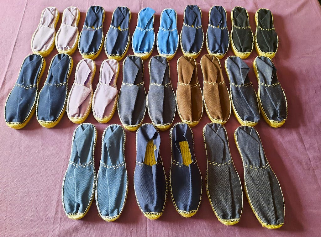 El modelo emblemático del saber hacer de Don Quichosse. Un patrón inmutable desde hace 4 generaciones, la parte superior de algodón, la costura totalmente hecha a mano, la "puntera musette" que proporciona ajuste al final del pie y finalmente la suela gruesa, de 30 hilos, recta, rematada con una capa de caucho natural. perfumado con limoncillo... ¡para ahuyentar a los mosquitos!